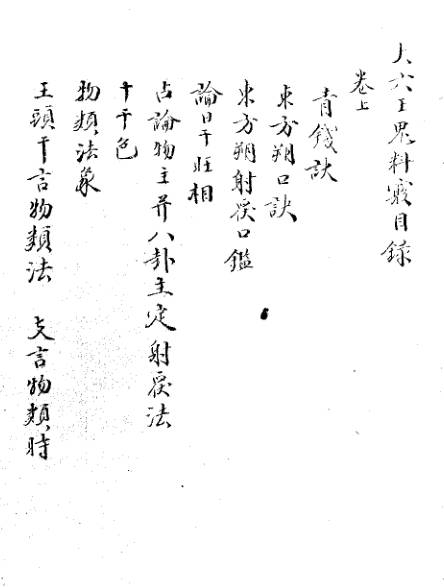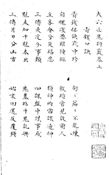 成书约在宋元,明季荥阳子辑入《大六壬丛书》。全书以短句歌诀为核心,收录《青钱口诀》《东方朔射覆口鉴》《金口诀》等要篇,专论射覆、谒见、求财、词讼等急断法门,少理论铺陈,多直断窍要与占验心诀。其 “料事如神” 的实战导向,与《苗公射覆鬼撮脚》并称壬学射覆与杂占双璧,是研究民间壬学实战传承的珍稀文献。