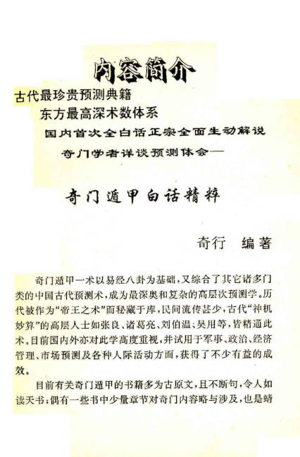 奇门遁甲白话精解 2026-01-09 奇门遁甲 资源下载下载价格5 金币VIP免费升级VIP立即购买购买说明:网站资源均使用百度网盘,如遇链接失效,请添加管理员微信补发,管理员微信:a18973288884 文件大小:26M,页数:114页 奇门遁甲白话精解以 “天、地、人、神四盘” 为核心框架,用通俗语言拆解概念、排盘与断局,帮你快速上手。以下分模块讲透,可直接落地实操。 本站为非营利公益网站,资源均来源于用户上传和网络,如有侵权,请联系客服微信:a18973288884,站长会及时处理,以保护你的权利。